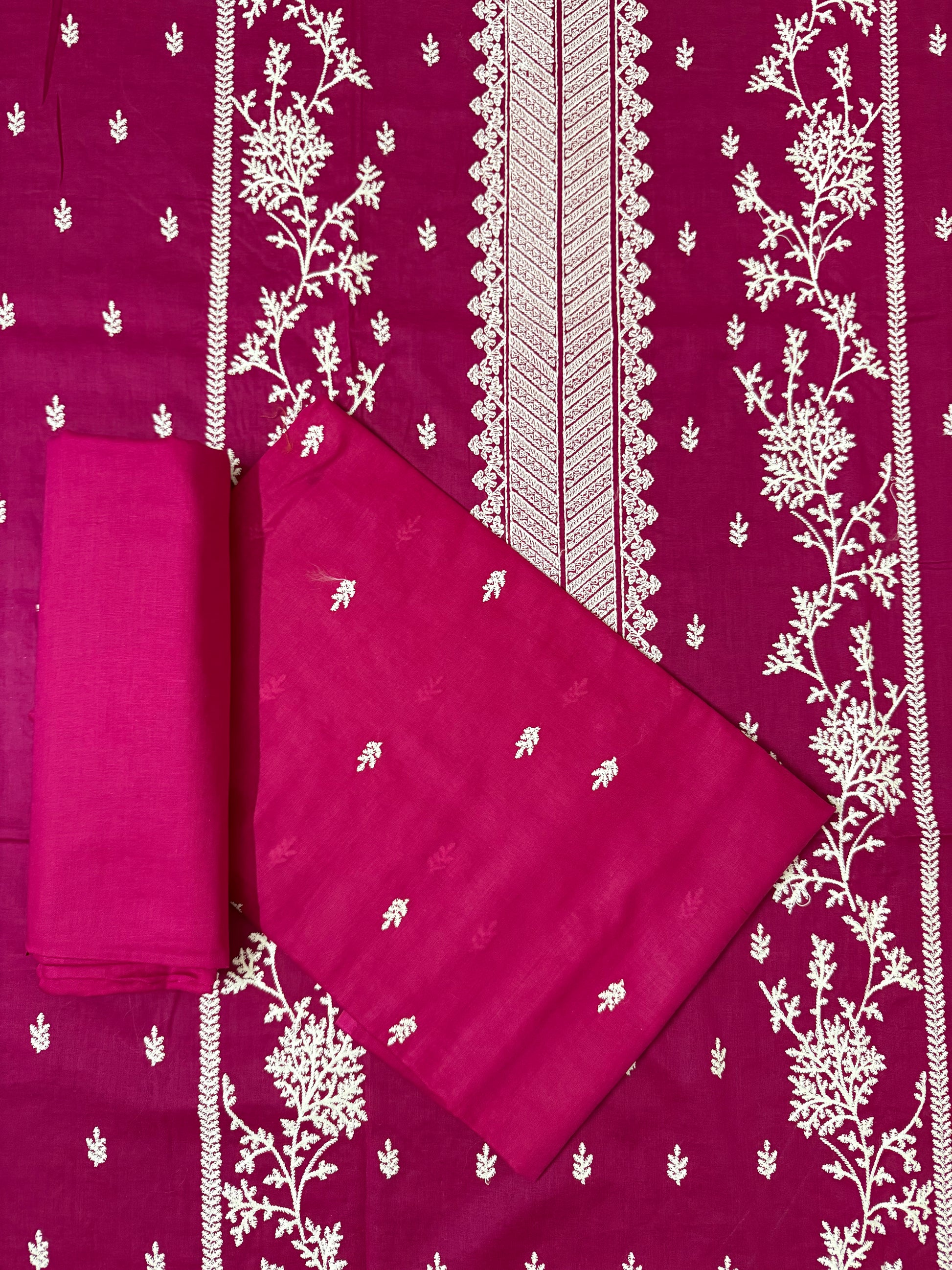 Step into elegance with our latest breathtaking Rose Pink 2-piece embroidered breeze lawn suit. Featuring intricate white embroidery in graceful floral and vine motifs, this unstitched ensemble radiates timeless charm and light summer comfort.